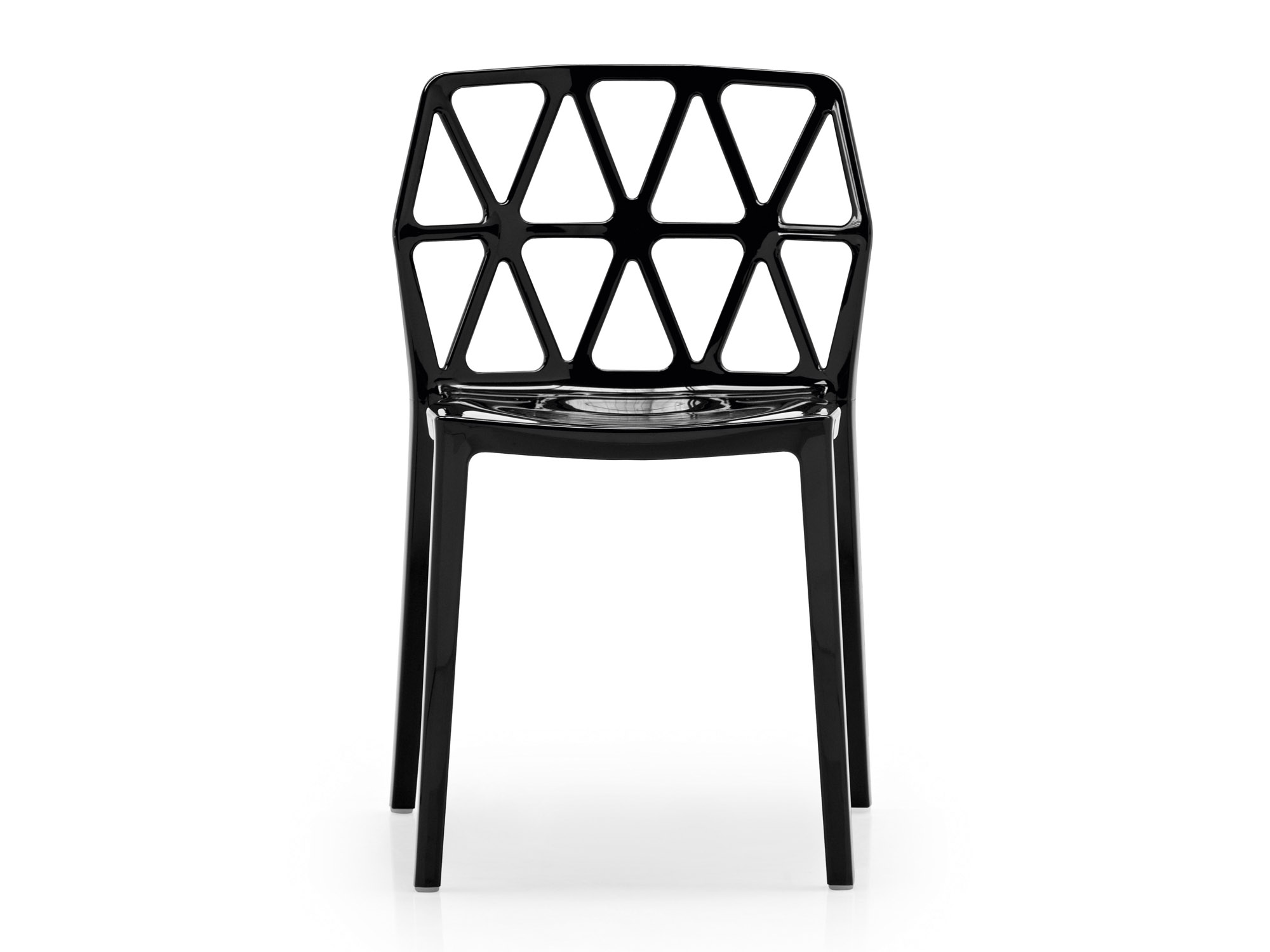 Modern, brightly coloured chair with a striking backrest design composed of cut-out triangles resembling the structure of an atom. A technopolymer monoblock made using the Airmoulding process makes Alchemia an extremely sturdy, lightweight and easy to clean chair. Stackable up to 6 chairs high, this chair can be used in different spaces such as bars, cafeterias or congress halls.
