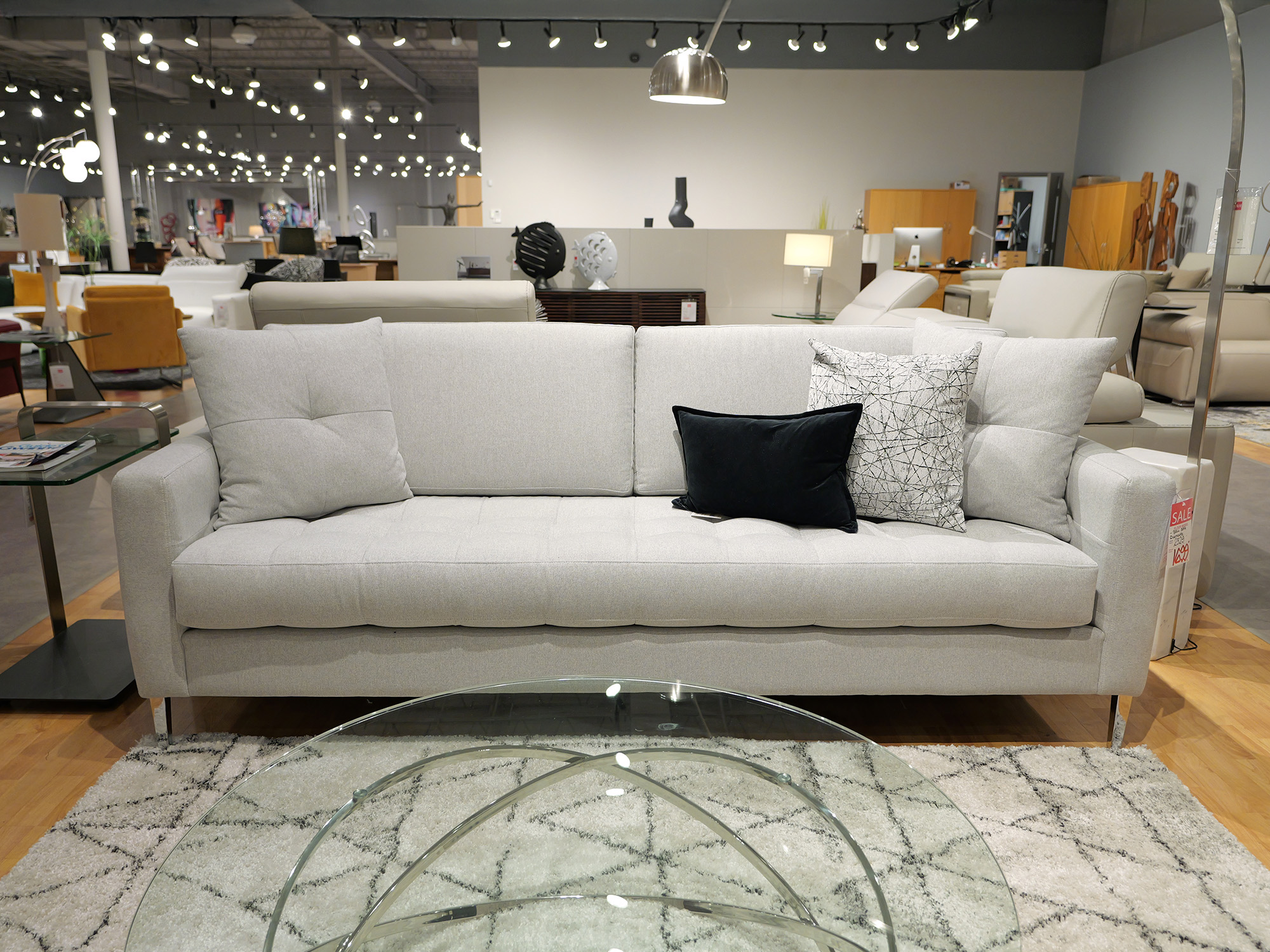 Diamonte sofa in Alpaca 062 performance fabric. Polished steel legs. Includes two toss pillows. Made in Canada by Bellini Modern.