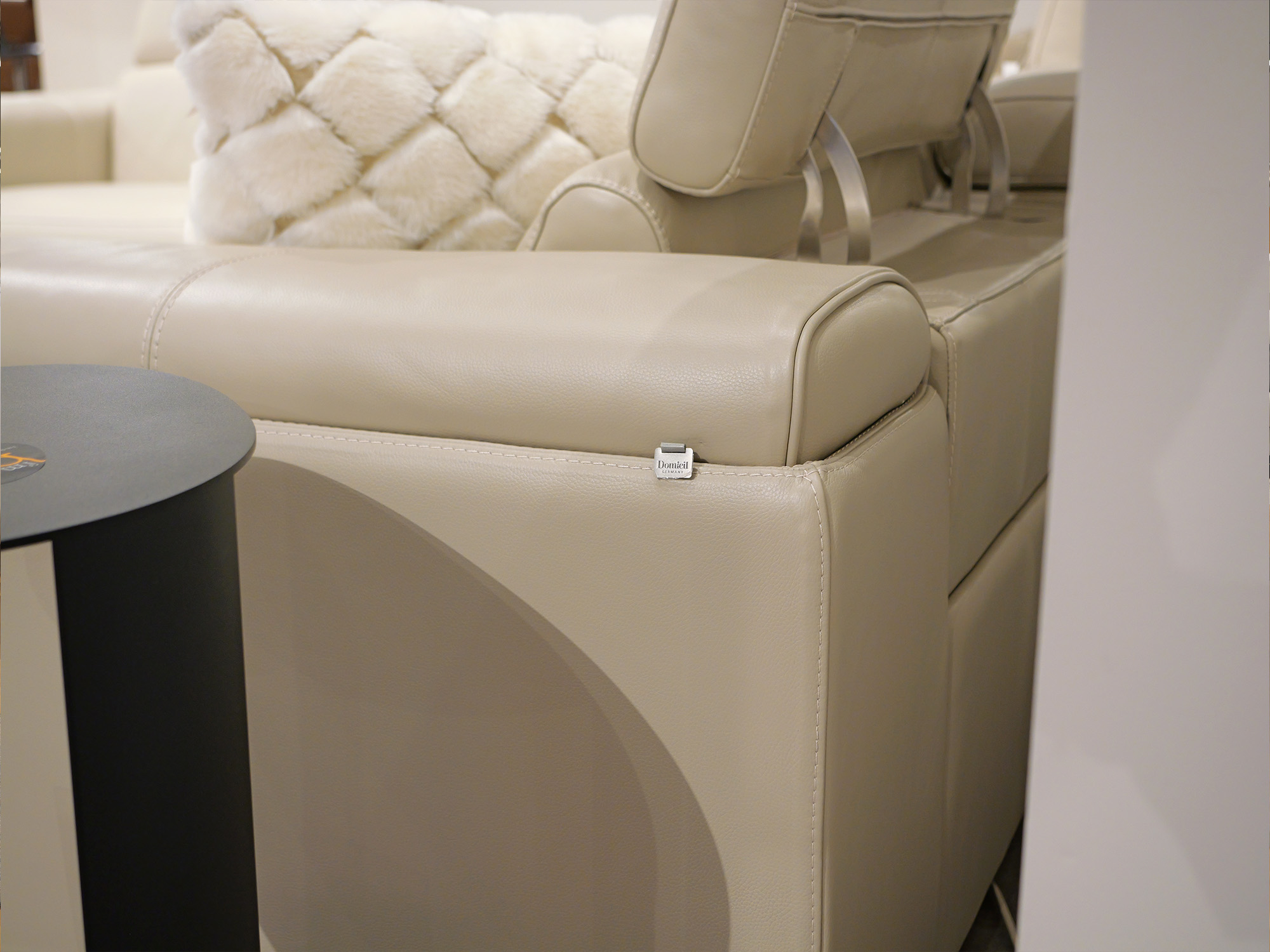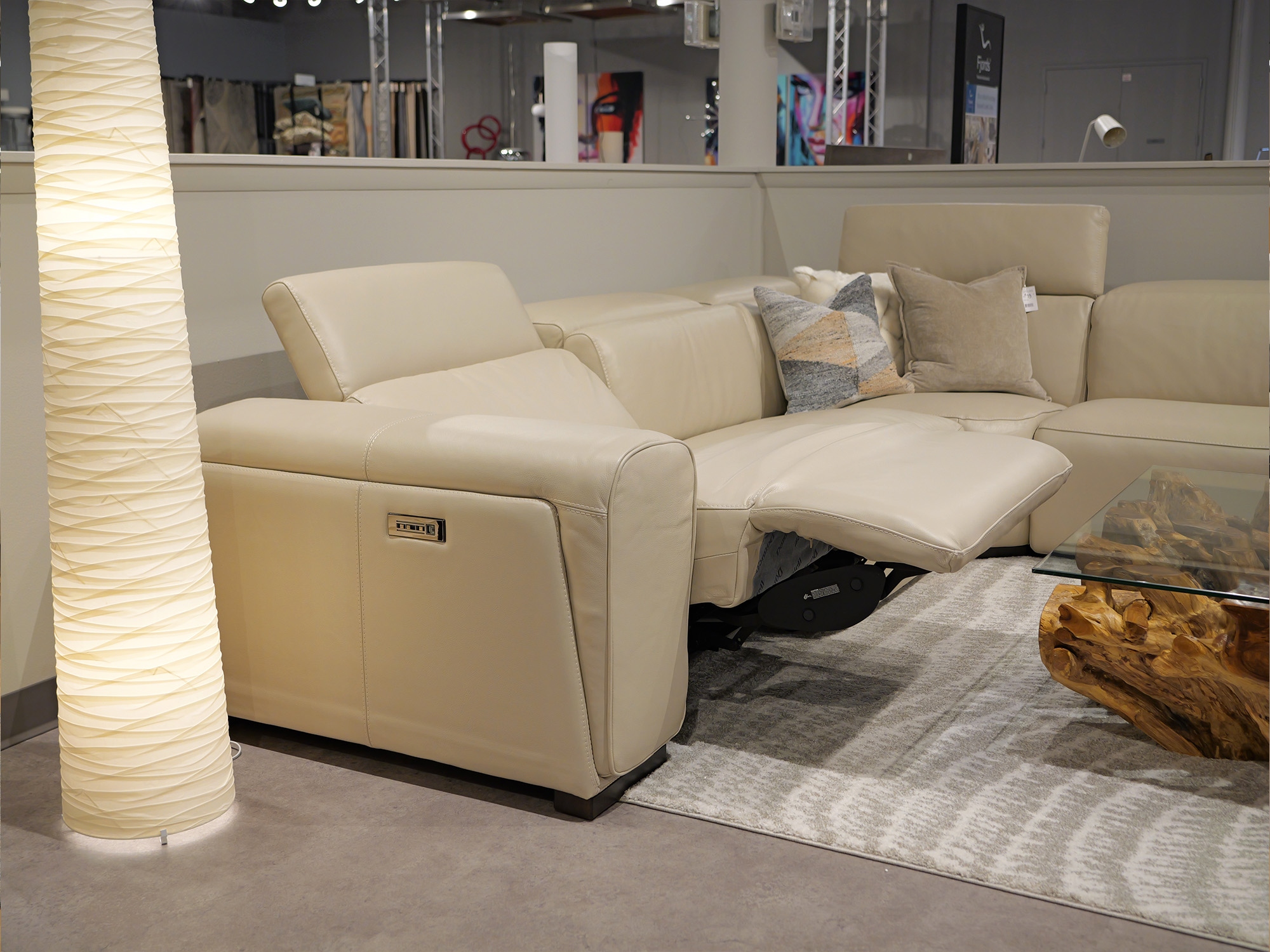 Polloc sectional by Domicil in New Club Silver Grey top grain leather with java stained wood feet. Sectional is configured with three power reclining seats and adjustable headrests.